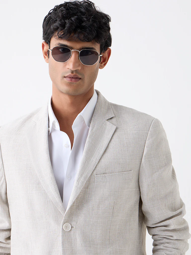Ascot Beige Checkered Relaxed-Fit Linen Blazer