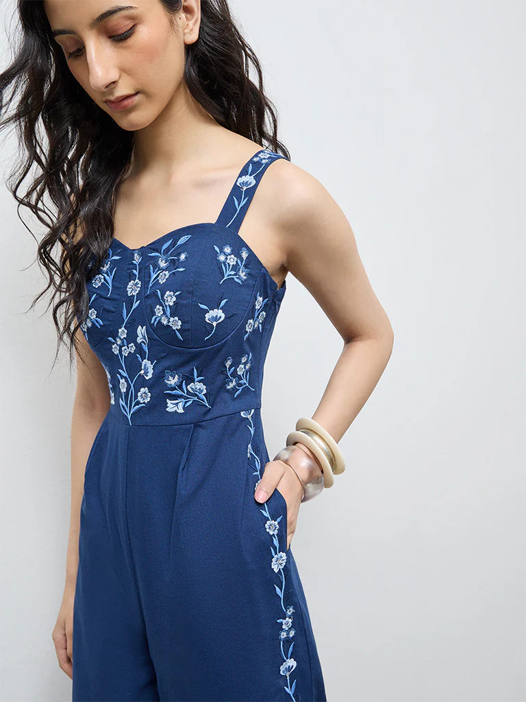 Bombay Paisley presents this blue embroidered jumpsuit designed for comfort and elegance. Shaped with a sweetheart neckline and bust-stitch detailing, it features floral embroidery along the sides for added depth. Crafted from a premium fabric, it includes side pockets for convenience, a subtly flared hem and a smocked back that creates a softly cinched waist.