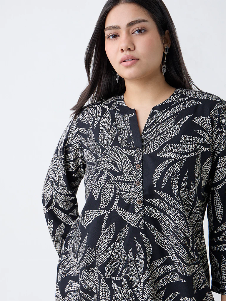 A thoughtful pick for everyday festive ease, this black tunic from Diza is crafted from breathable fabric that feels soft through the day. Bandhani-style leaf motifs add gentle festive charm, while the mandarin neck with a quarter button placket and three-quarter sleeves keep it effortless for daily wear.