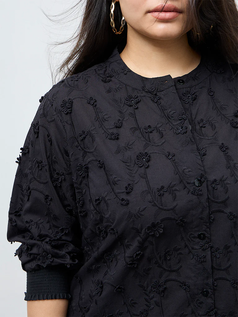 This black tunic from Diza features tonal floral embroidery adds gentle character to the design. Styled with a round neck, button-up front and peasant, it is spun from a soft, breathable fabric that ensures lasting comfort through the day. This is a graceful option that pairs well with both tailored bottoms and easy casual separates.