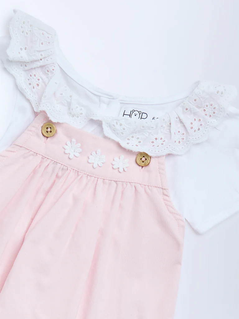 HOP Baby presents this charming T-shirt and pinafore set for infant girls. The white T-shirt features a round neckline accented with frill lace detailing, adding a soft touch. Paired with a light pink cotton pinafore adorned with floral embroidery and small open pockets with ruffle details, the set offers a sleek, feminine and classic appeal.