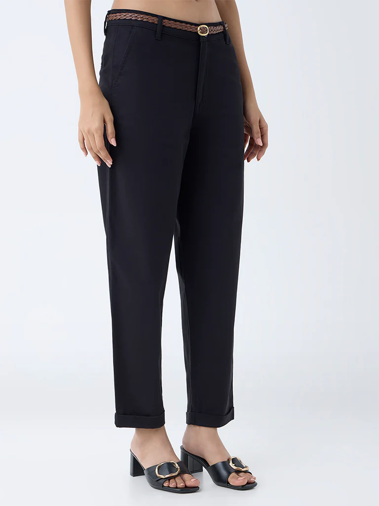 LOV Black Mid-Rise Cotton-Blend Trousers with Belt