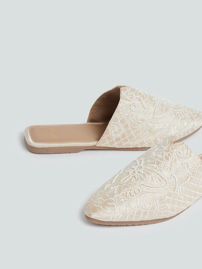 Slip into style for the festive season by choosing these beige mules by LUNA BLU. Working beaded detailing on the textured upper for traditional appeal, the pair comprises of a cushioned footbed and can be paired with a variety of looks for a classic finish.