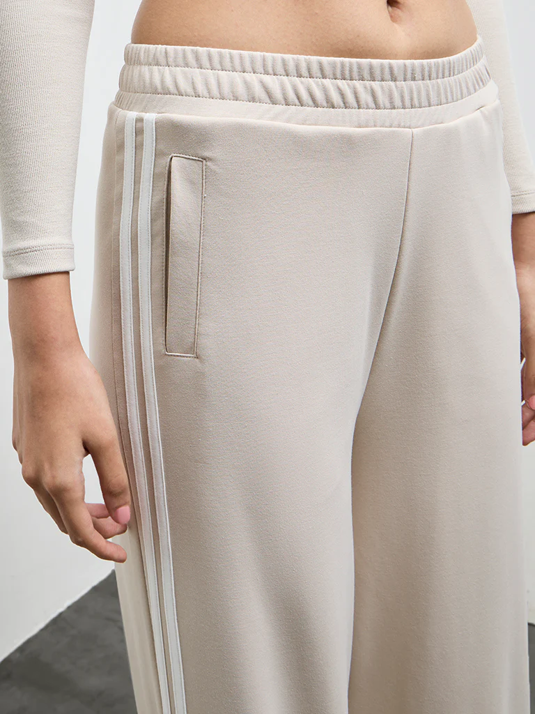 Nuoflexx adds an easy, sport-inspired update to everyday activewear with these beige track pants. Designed with contrast stripe detailing along the legs, they offer a crisp, athletic look. The high-rise waist is finished with an elasticated waistband for a comfortable, secure fit, while side pockets bring practical ease. Made from a smooth, lightweight fabric, this pair transitions effortlessly from workouts to casual outings and relaxed off-duty wear.