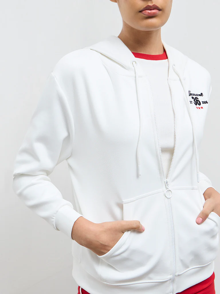 This white jacket from Nuoflexx is designed with an attached hood with adjustable drawstrings, a zip-through front and full sleeves for a streamlined design. A minimal text detail on the chest elevates the look, while kangaroo pockets enhance everyday utility. Created from a breathable fabric, it maintains structure while allowing ease of movement.