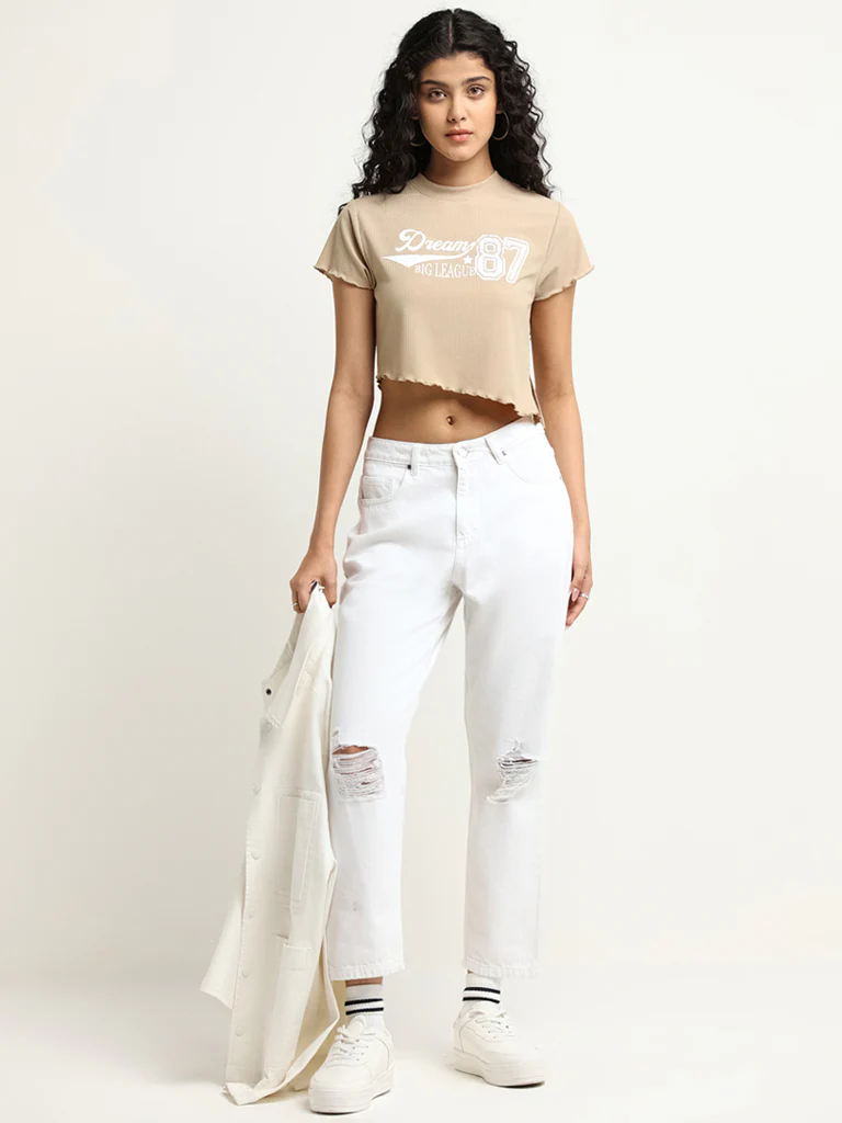 The Nuon beige crop t-shirt features a retro vibe with its bold graphic print, raw hem, relaxed fit, high neck and short sleeve.