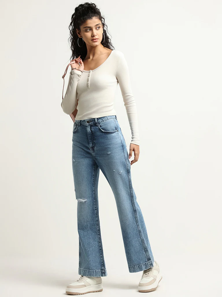 This Nuon off-white top features a flattering henley neckline with button details, long sleeves, and a snug fit in a versatile beige.