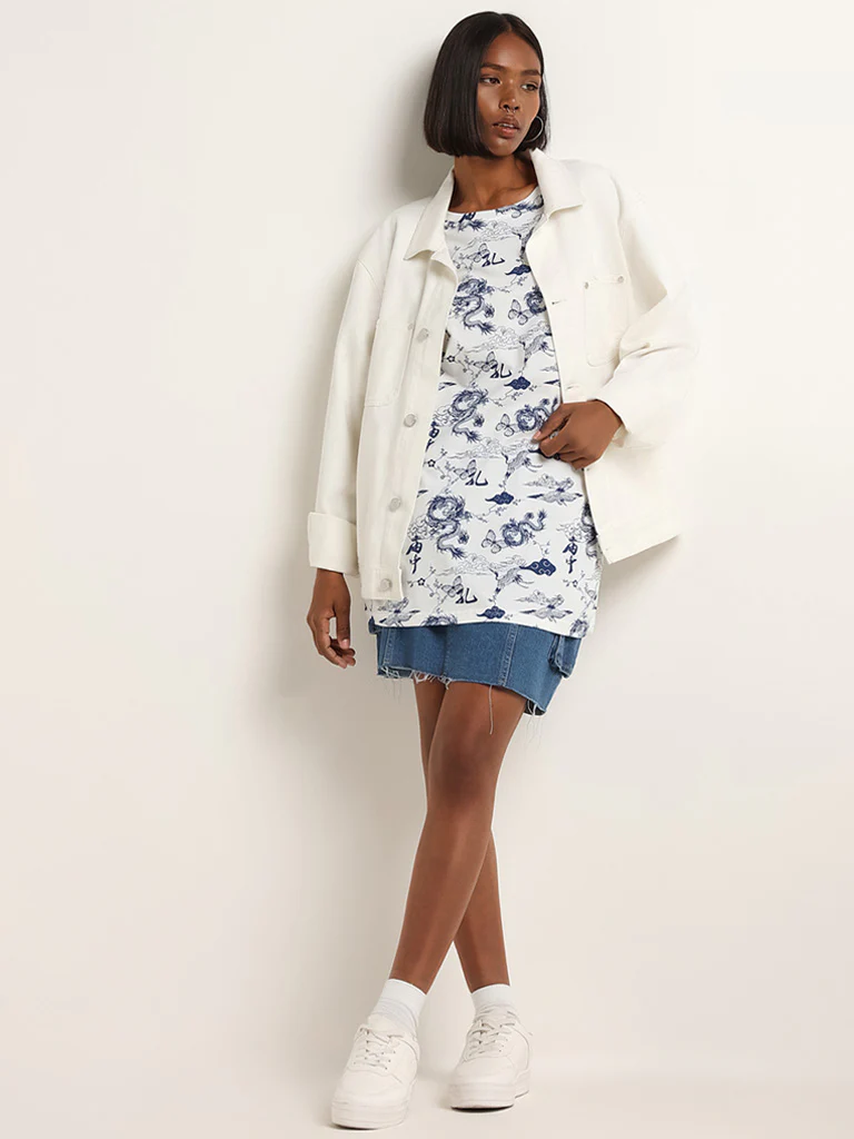 Nuon White Contrast Print Cotton Oversized T-Shirt