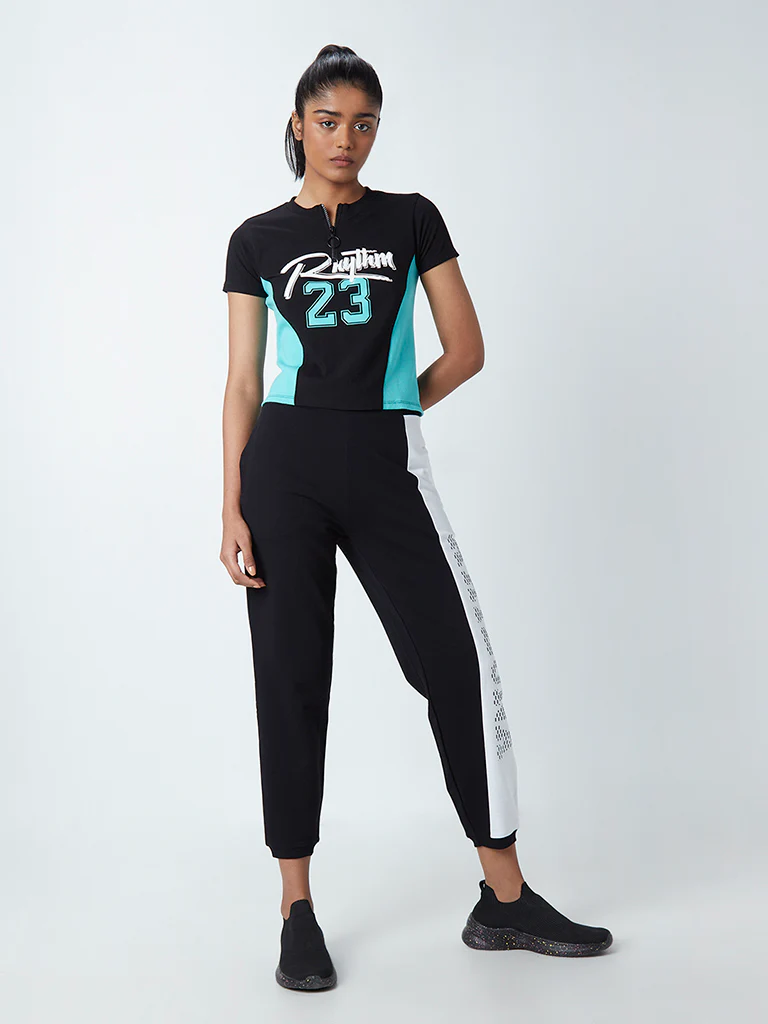 Studiofit Black Typographic Design Cotton-Blend Crop T-Shirt