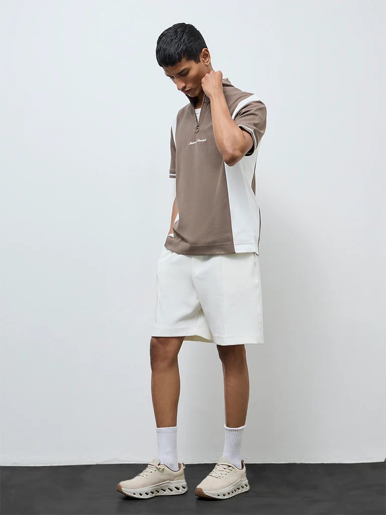 Studiofit Brown Text Design Quarter-Zip Slim-Fit Cotton-Blend T-Shirt