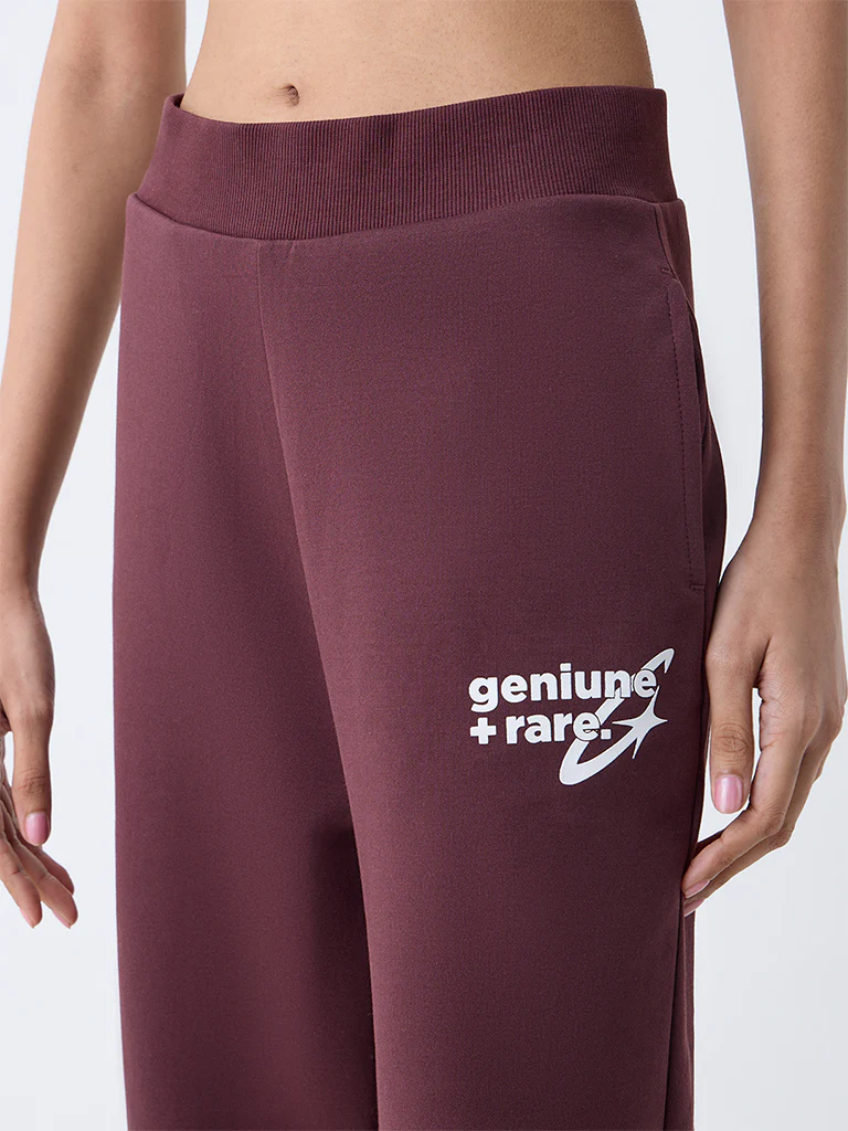 Move with ease and style in these dark brown Studiofit pants. Constructed from premium cotton-blend, they offer breathable comfort for workouts or casual days. Text detailing at the front adds subtle sporty flair, while the elastic waistband ensures a secure fit. Convenient side pockets keep essentials close, making them perfect for gym sessions and beyond.