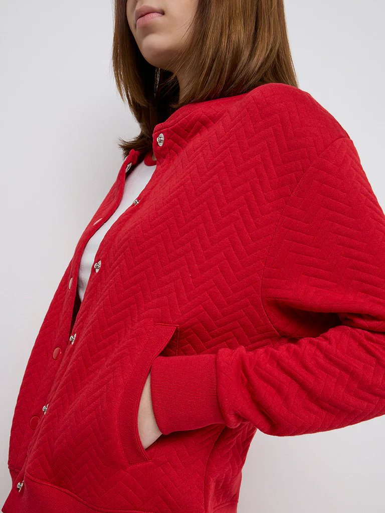 Crafted with a chevron-textured finish, this red jacket from Studiofit boasts a band collar that extends to a button placket and full sleeves. The kangaroo pockets at the front lend a functional bonus.