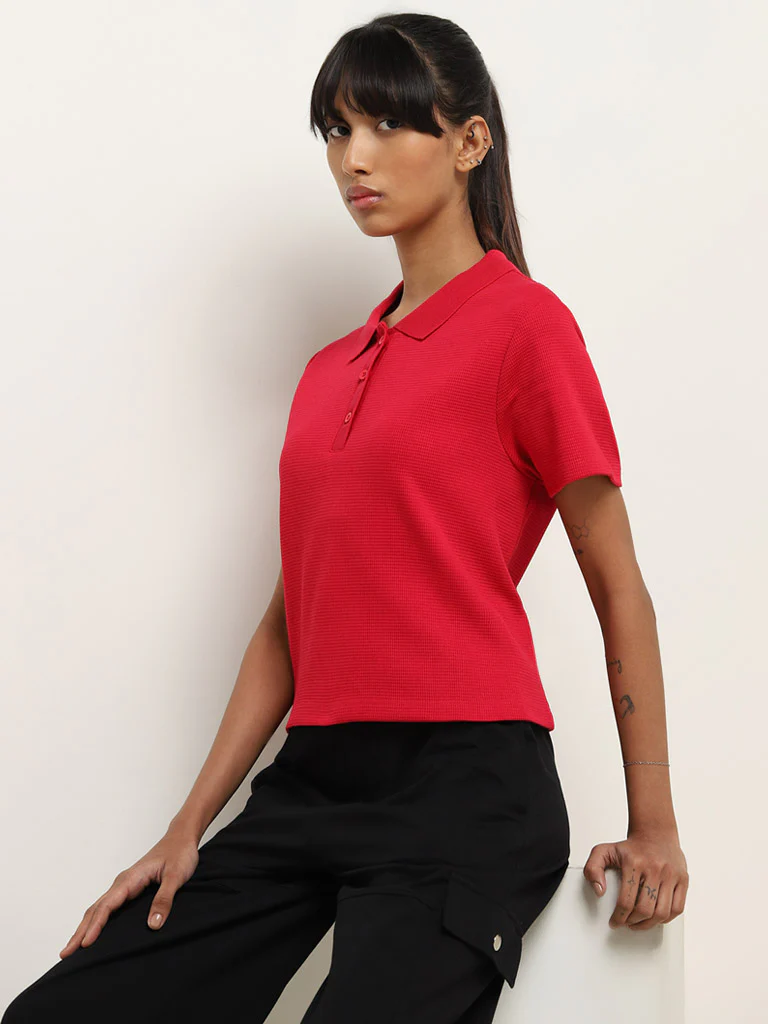 Studiofit presents this red ribbed t-shirt with a collar, three-button placket, and short sleeves, made from pure cotton.