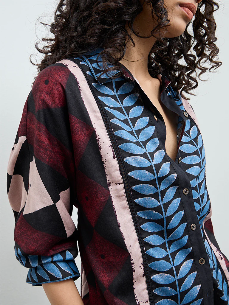 This black floral printed cotton tunic from Utsa blends classic styling with refined ethnic charm. Designed with a notched collar and three-quarter sleeves, it offers a structured yet comfortable silhouette. Crafted from breathable cotton, the versatile design transitions effortlessly from casual to semi-ethnic looks, pairing well with trousers, palazzos, or skirts for everyday elegance.