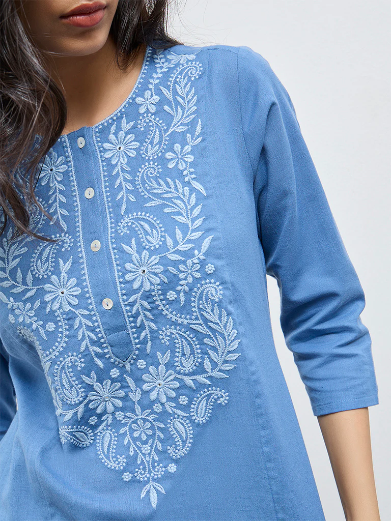 Crafted with an eye for graceful detail, this blue kurta from Utsa features floral embroidery that lends a timeless charm. The round neckline flows into a button placket, while three quarter sleeves and a side slip pocket add practicality. Finished in an A-line silhouette, it offers comfort with a softly elegant presence for daily ethnic styling.