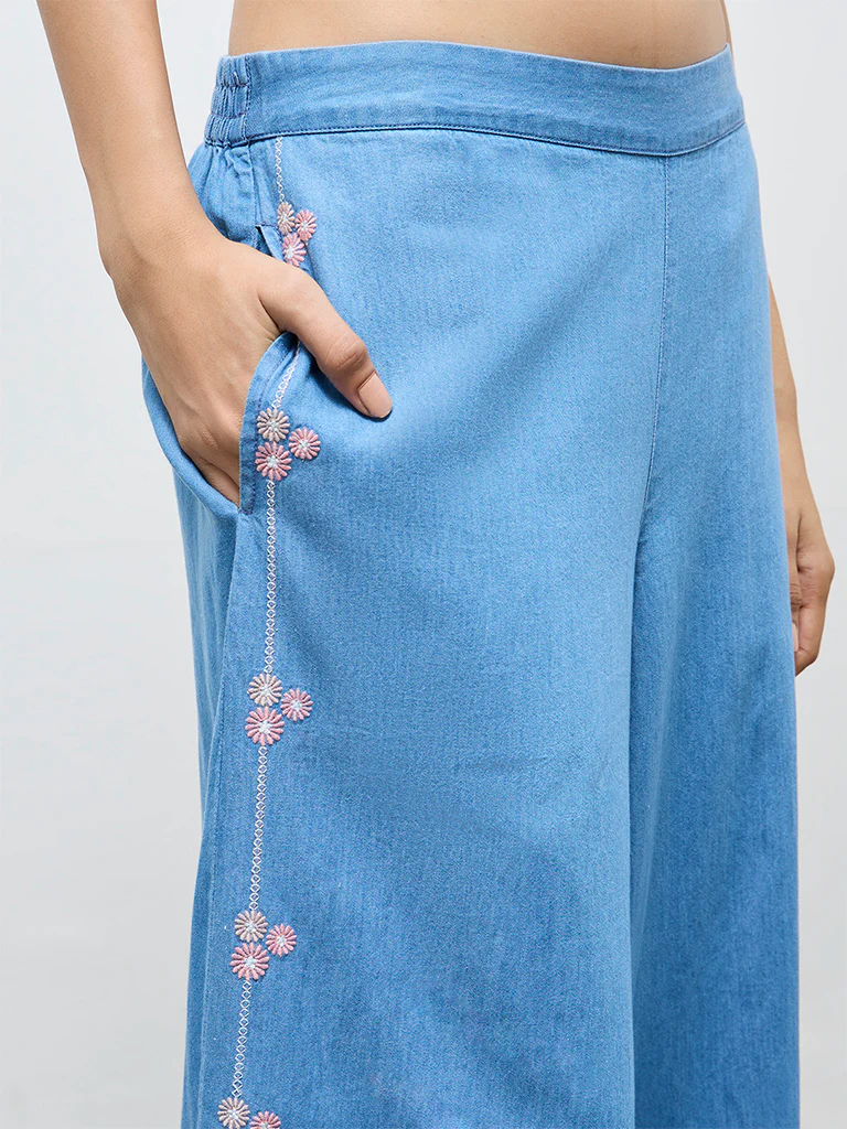 Designed for ease with a hint of detail, these blue palazzos from Utsa are crafted from breathable cotton with a softly flared shape. The elasticated waist ensures comfort, while delicate floral embroidery along the sides and hem adds a refined touch. Finished with functional pockets, they pair beautifully with kurtas for effortless everyday ethnic looks.