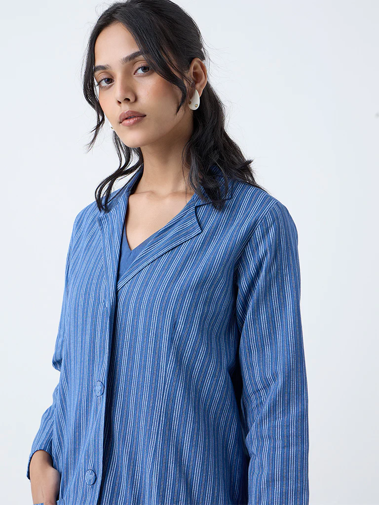 Utsa Blue Stripe Printed Cotton Jacket