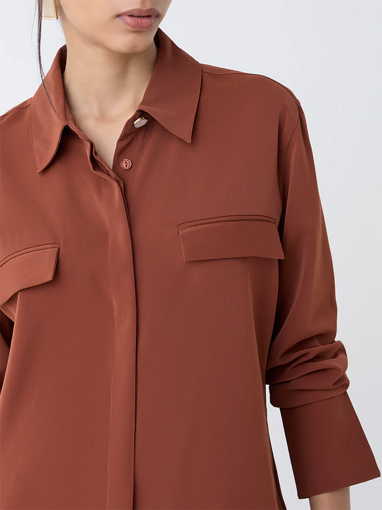 Wardrobe brings this brown shirt featuring a crisp collar, a concealed button placket and full sleeves. It is completed with two imitation pockets in the front for a structured appeal while the soft, breathable fabric composition allows all-day soft feel. A refined piece that pairs effortlessly with tailored separates for a composed look.