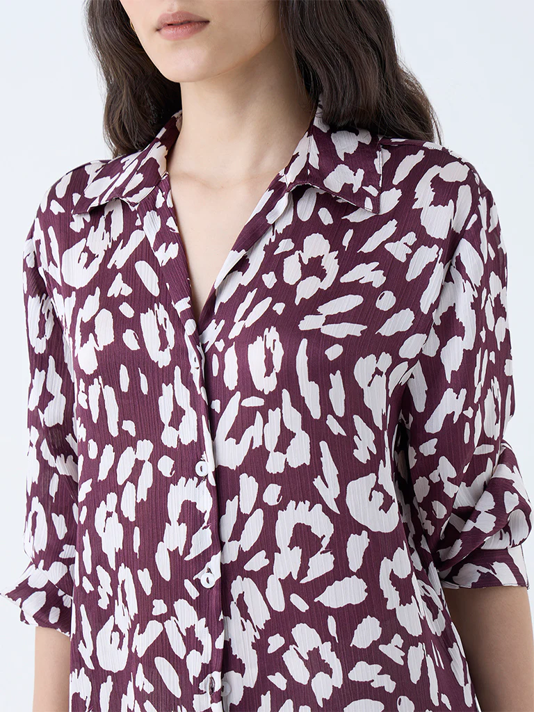 Make a polished impression in your meetings with this burgundy shirt from Wardrobe. Made from premium-quality fabric and defined with abstract patterns, it is styled with a sharp collar and full sleeves for a refined finish.