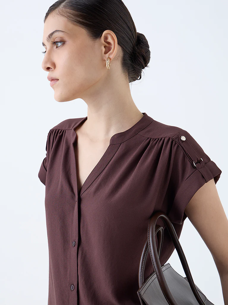 Wardrobe reinvents everyday classics with this dark brown shirt, tailored in a minimal profile. Spun from a premium fabric for all-day comfort, it features a mandarin neck that extends to a button-up front and relaxed dolman sleeves.