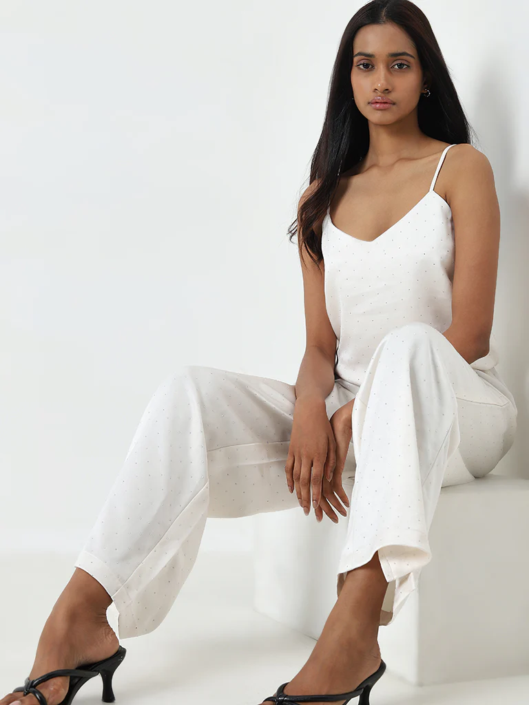 This ivory top from Wardrobe flaunts dainty embellished detailing. Created from a lush fabric, it comes fitted with a V-neck and spaghetti straps.