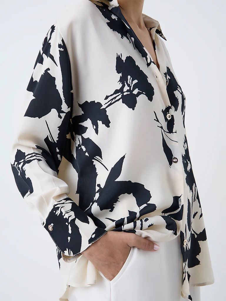 Wardrobe lends a bold update to everyday styling with this off-white shirt. Defined by bold botanical prints, it’s cut from a soft, fluid fabric that drapes effortlessly. The V-neck, button-up front and long sleeves give it a sharp finish while keeping the look relaxed and easy.