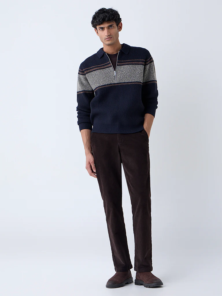 WES Casuals introduces an updated take on a timeless knit navy sweater , exhibiting a bold colour-blocked design to create an everyday look. The relaxed silhouette is complemented by a collared neck and a clean half-zip, adding a hint of sporty refinement. Its soft, breathable knit keeps you comfortably warm, while ribbed finishes at the cuffs and hem maintain structure.