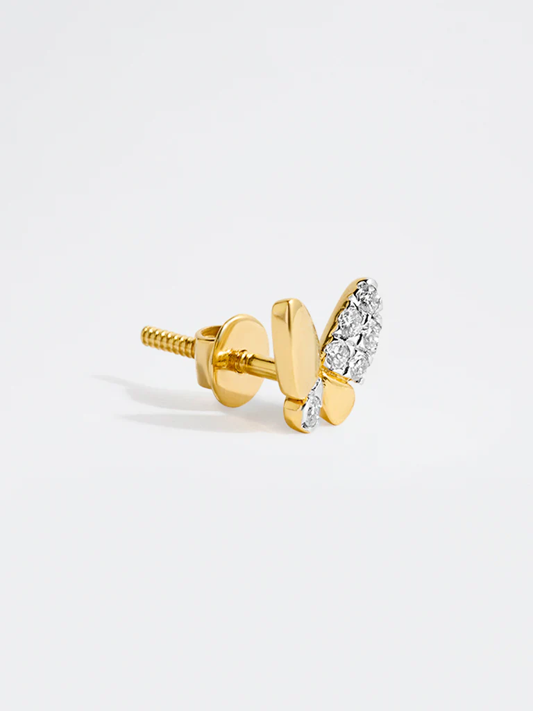 Capture delicate beauty with these butterfly earrings from WHITE DOOR x POME LUXE. Finished in a warm gold tone and accented with lab-grown diamonds, the graceful silhouette adds a soft shimmer. Lightweight and elegant, they lend a refined touch to everyday dressing while celebrating freedom, change, and timeless femininity.
