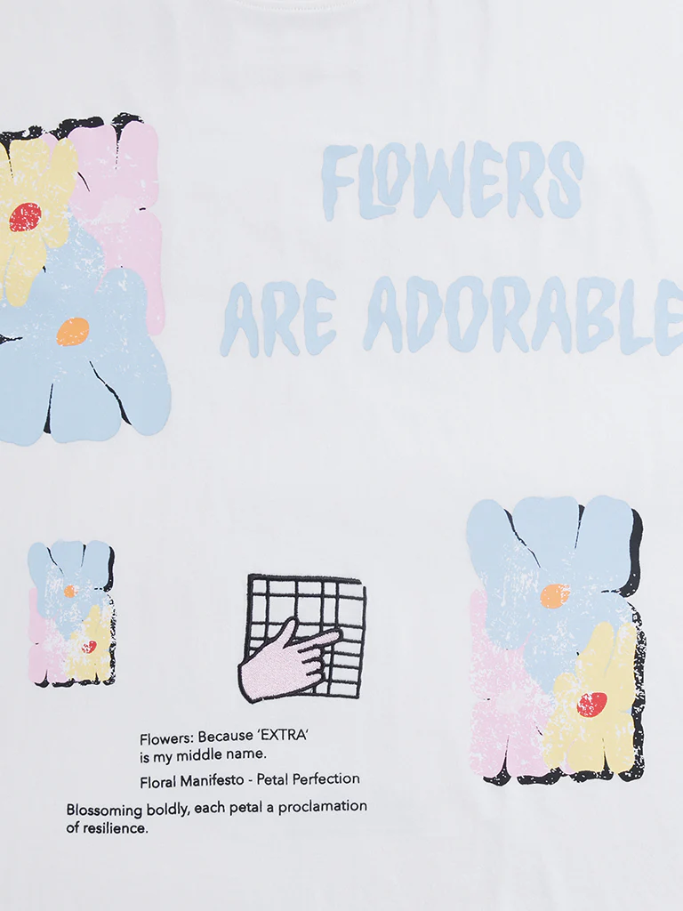 This off-white t-shirt by Y&F kids features a classic crew neck and short sleeves, adorned with floral and text prints on both the front and back for a playful touch.
