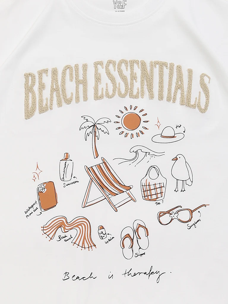 The Y&F kids white t-shirt showcases a playful "beach essentials" graphic prints, short sleeves, and round neck.