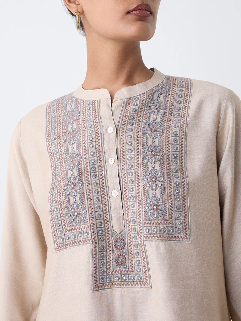 This beige tunic from Zuba brings together artisanal finesse and contemporary poise. The intricately embroidered yoke adds a graceful heritage touch, while the mandarin neckline and buttoned front lend refined structure. Finished with full sleeves, it drapes beautifully for festive gatherings, elegant daytime dressing, or serene evening wear.