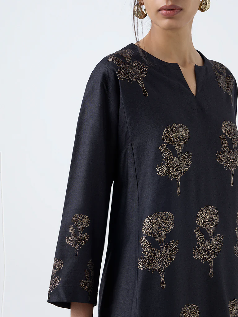 Minimal yet striking, this black kurta from Zuba is tailored in an A-line silhouette for a flattering fall. Crafted from a premium-blend fabric, it features elegant floral prints that lend quiet sophistication. The design is framed with a split and three-quarter sleeves, making it a refined choice for daytime occasions.