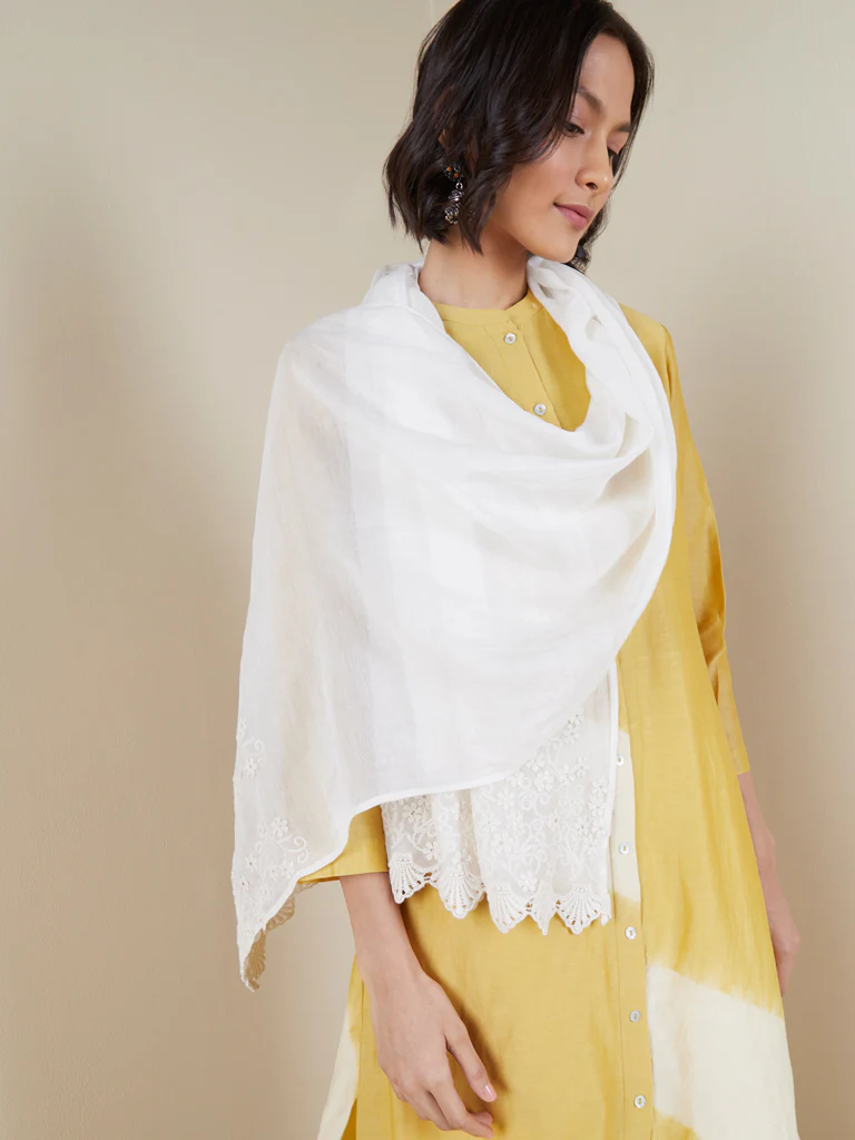 Give your ethnic semblance an elegant finish with this off white stole from Zuba. Enhanced with floral appliqu and scalloped trims for feminine appeal, this piece is fabricated from a soft cotton-silk blend which provides endless breathability.